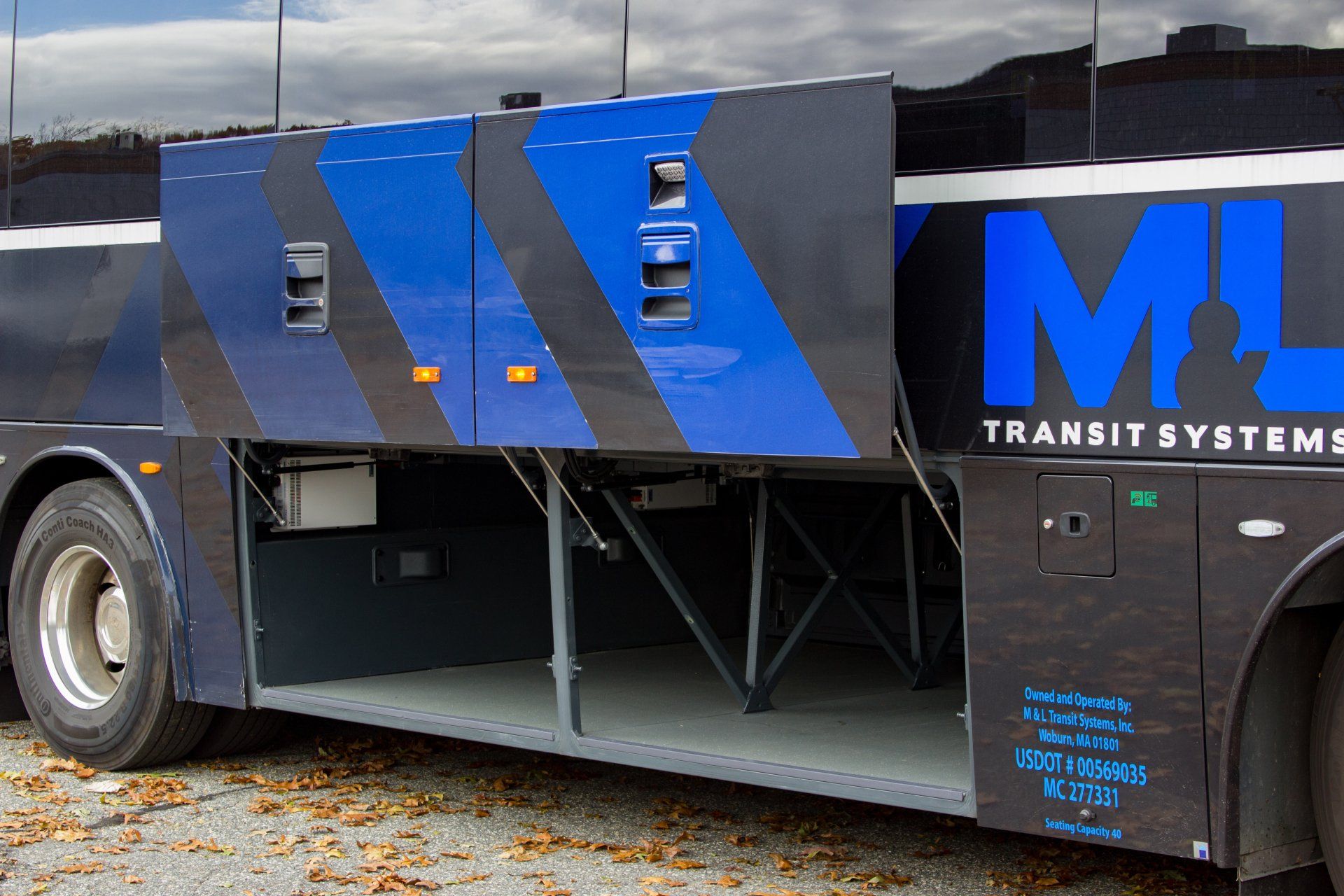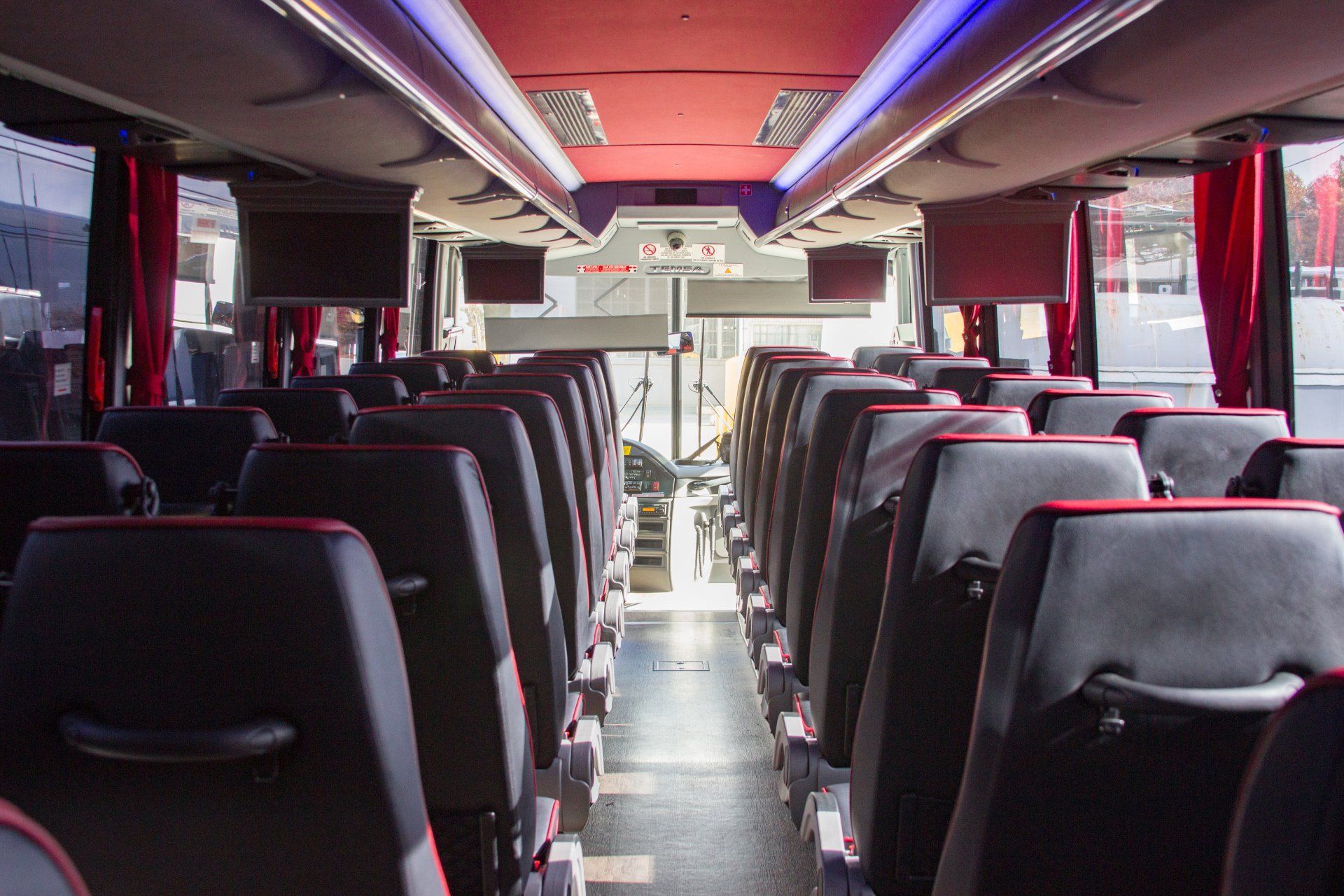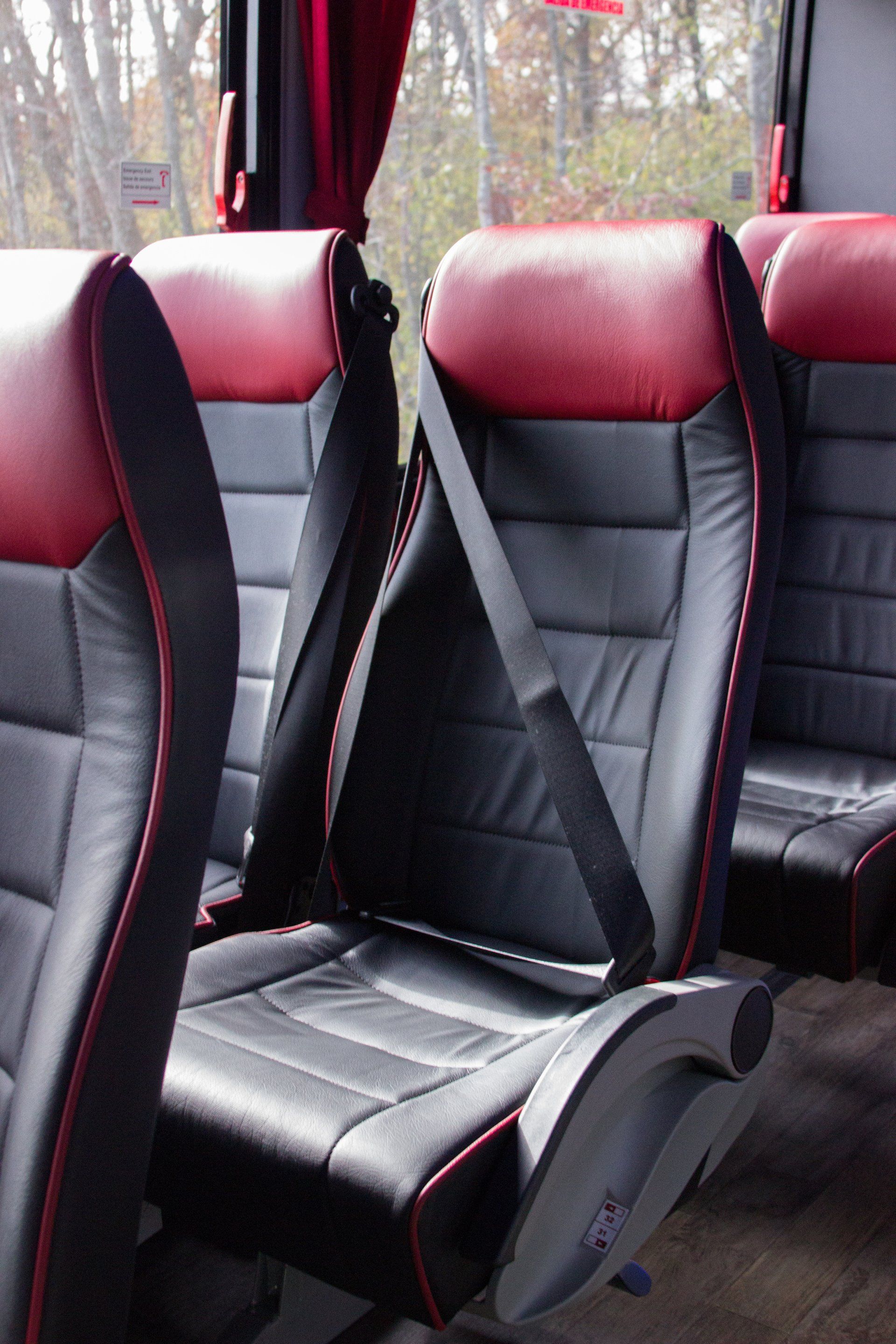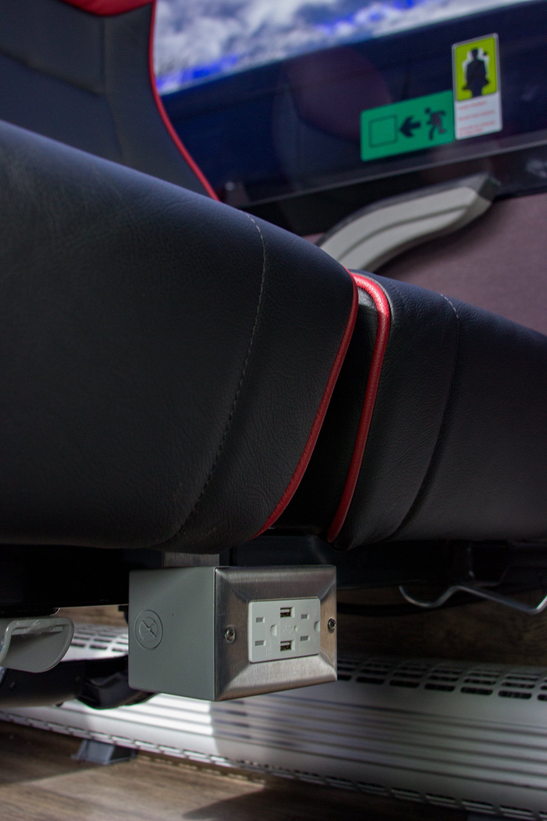 Our 40 passenger premium flagship coach includes A/C, CD/DVD player, USB & 110AC outlets per seat, monitors, intercom system, high-back reclining leather seats with 3-point seat belts, reading lights, luggage racks, wood grain floor, and a lavatory with a hand wash station.