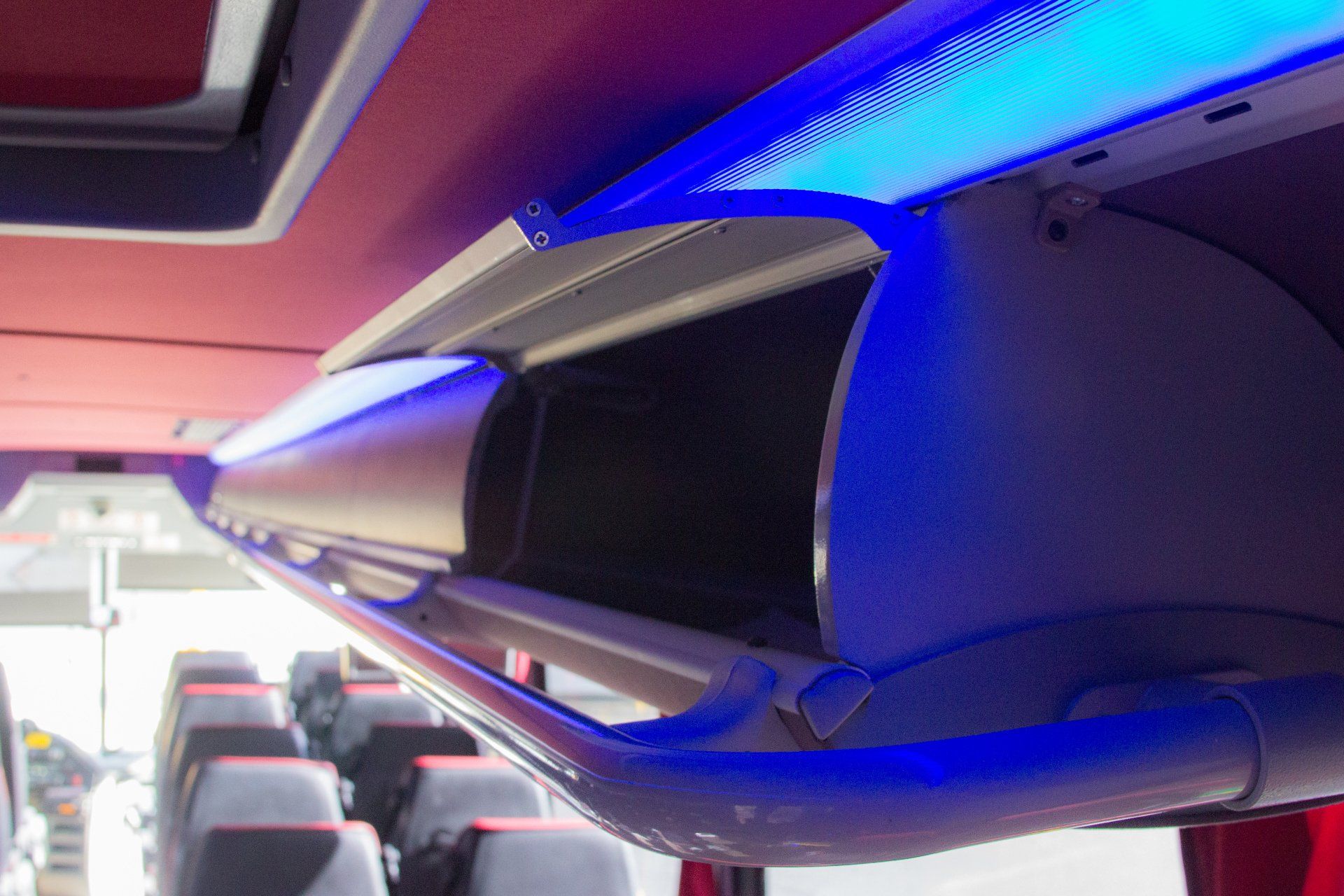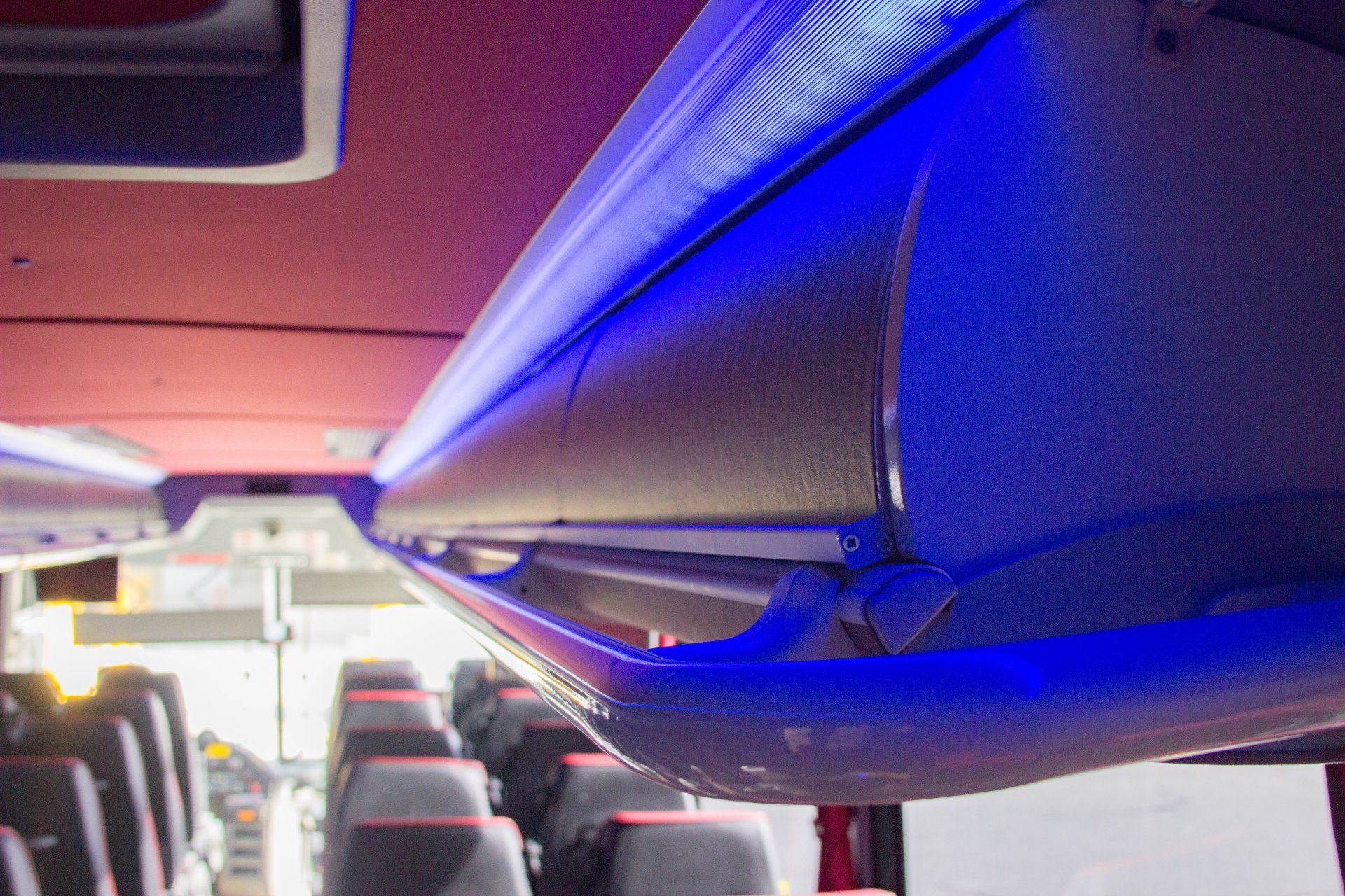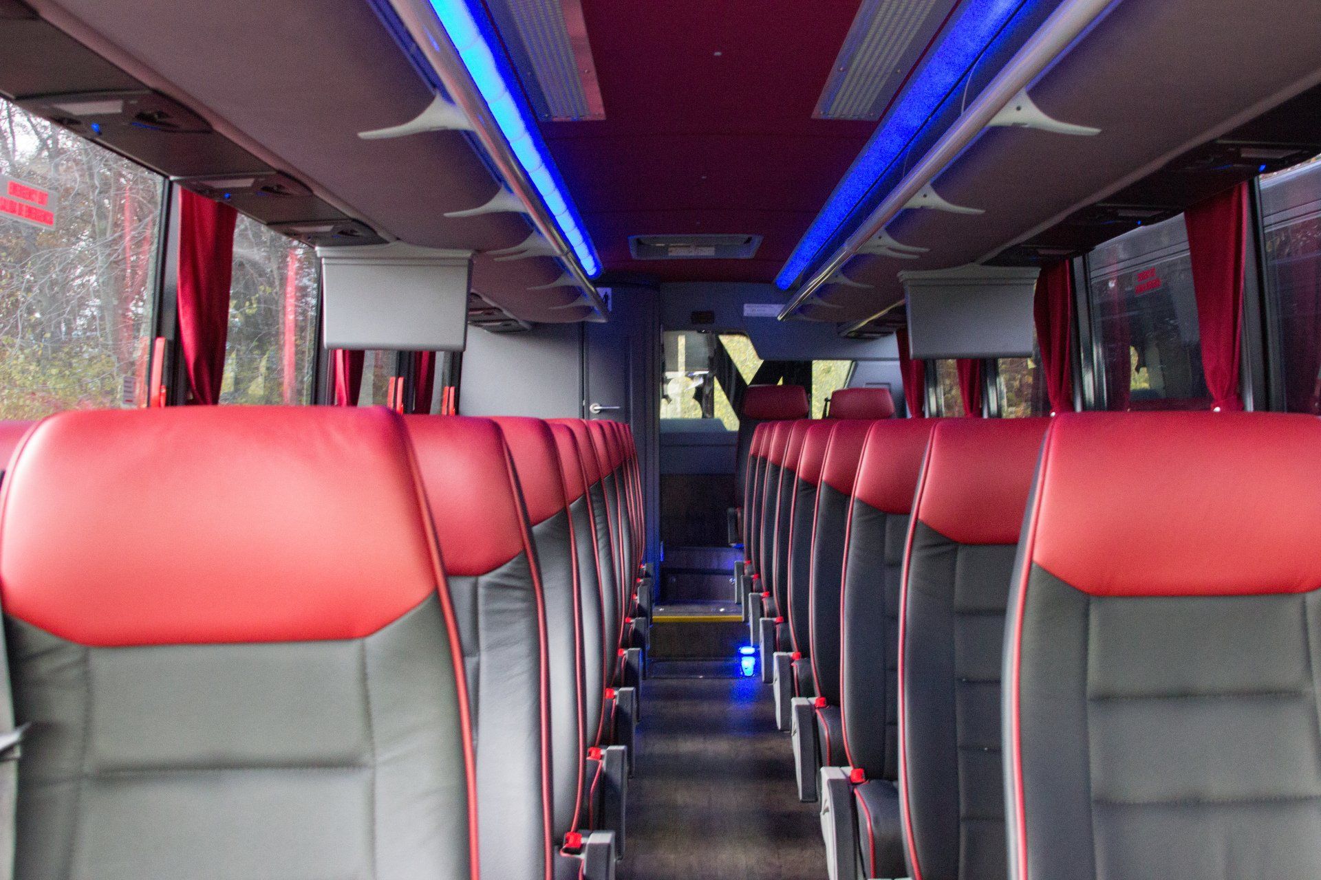 Our 40 passenger premium flagship coach includes A/C, CD/DVD player, USB & 110AC outlets per seat, monitors, intercom system, high-back reclining leather seats with 3-point seat belts, reading lights, luggage racks, wood grain floor, and a lavatory with a hand wash station.