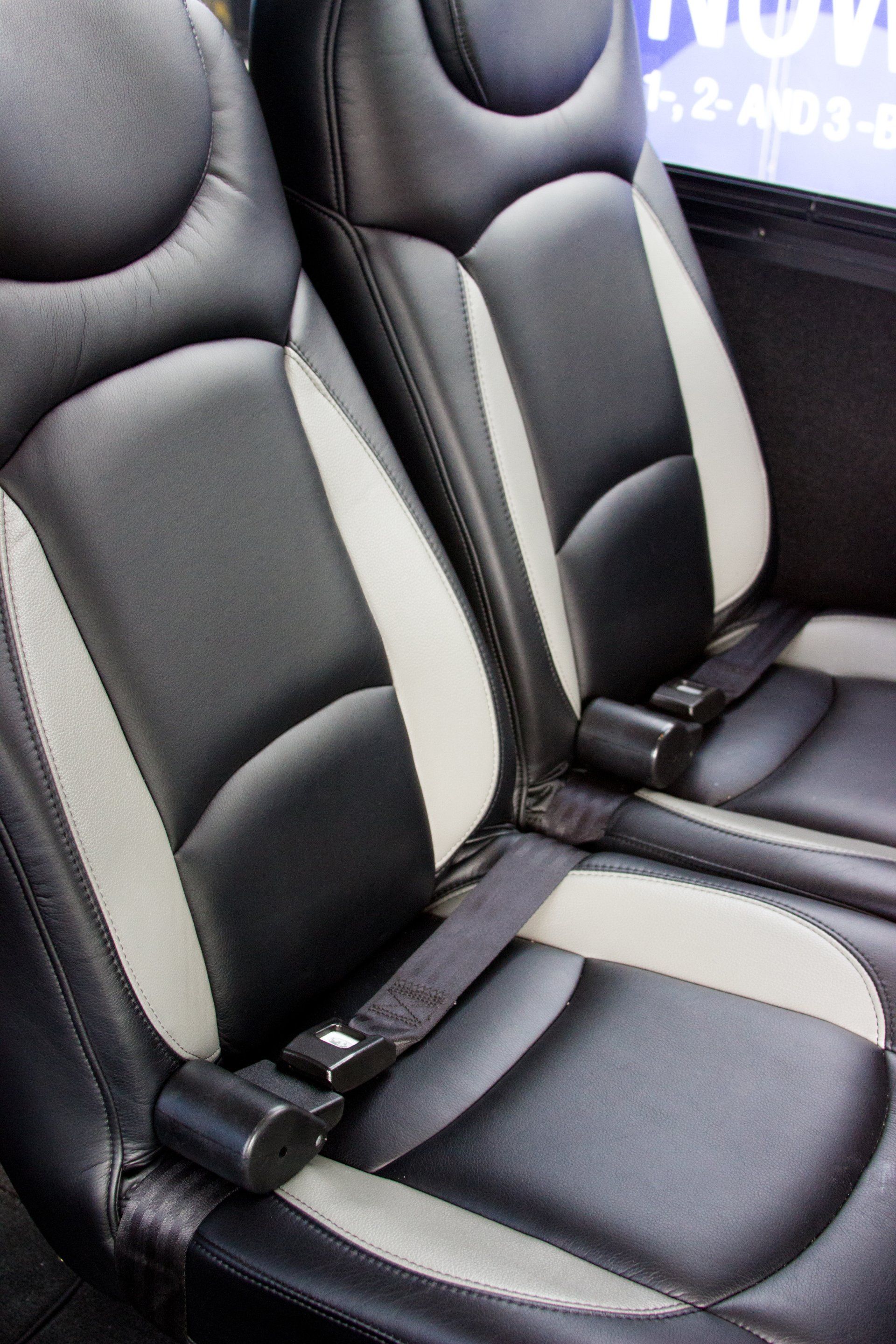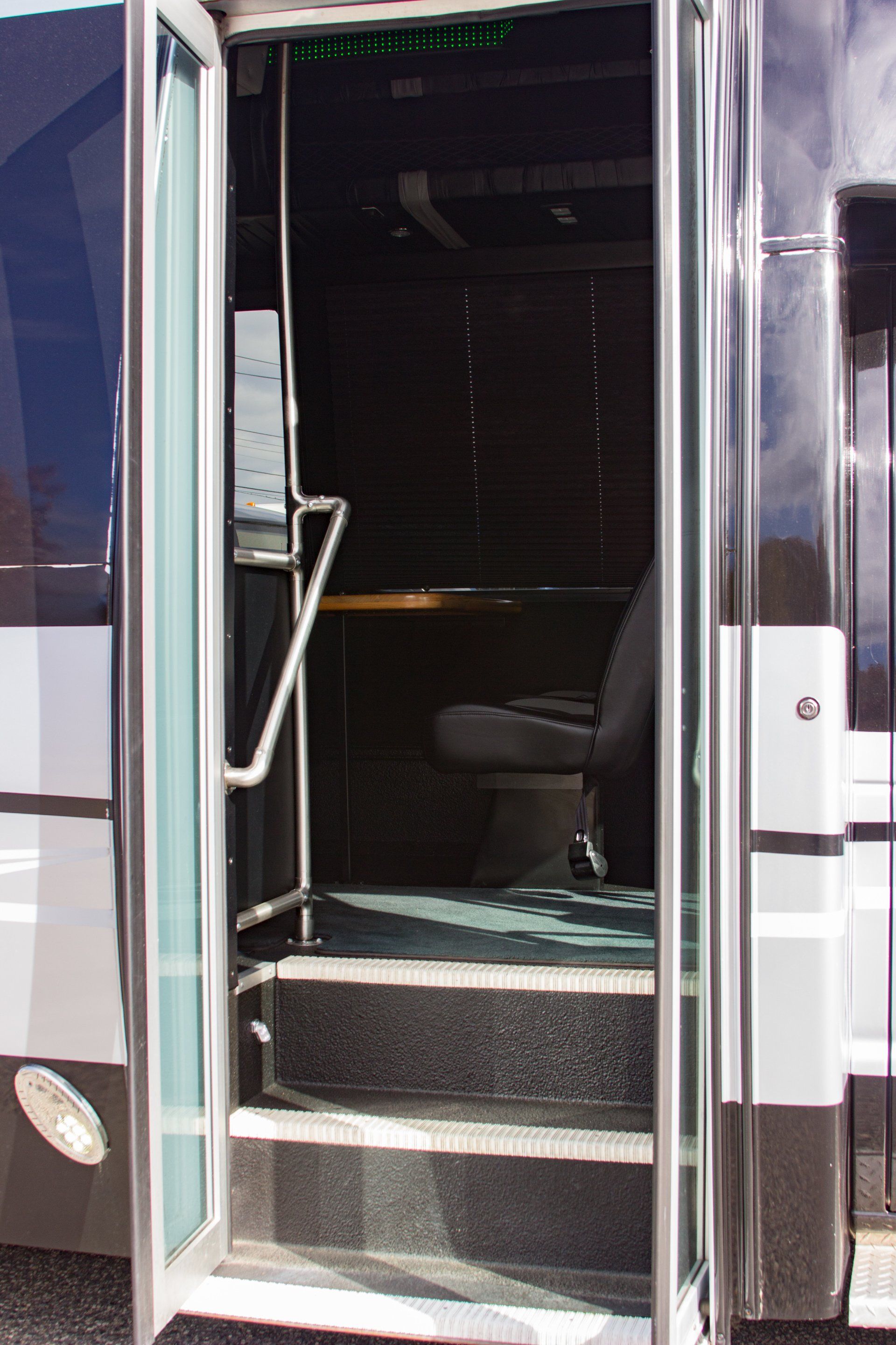 This luxurious bus comes with an AC, CD / DVD system, window shades, carpeted flooring, P/A system, large rear luggage compartment, wrap-around leather couch, high-back reclining captain’s chairs with table, seat belts, fiber-optic lighting, and two plasma screens. Contact